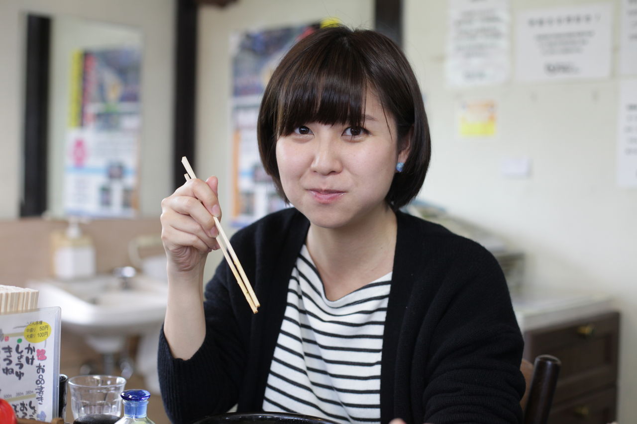 うどんを少し食べてから、いよいよゆず果汁を手に持ちます。
