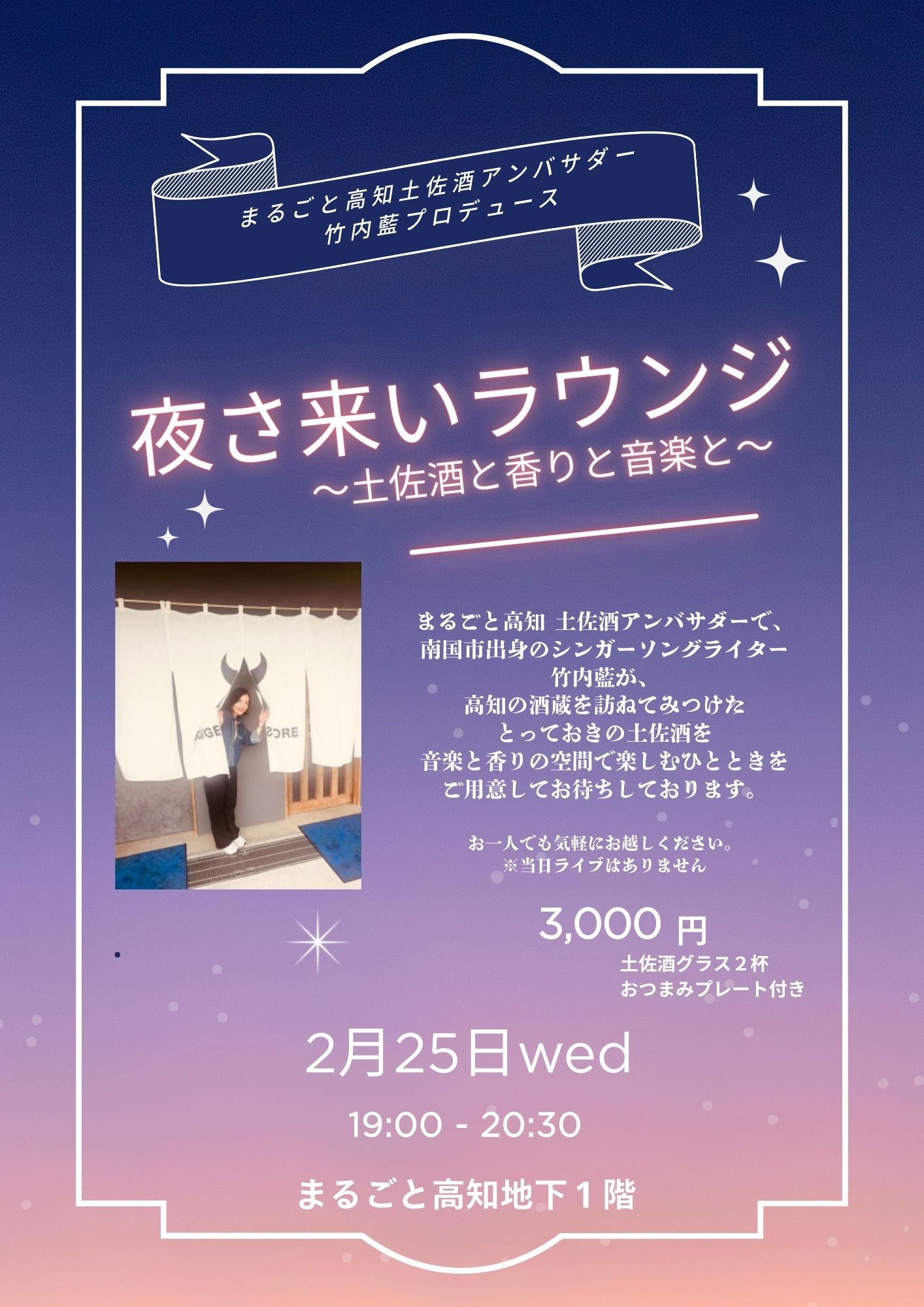 2026-0217【新企画】夜さ来いラウンジフェア・イベント情報いつもよりワンランク上の土佐酒を、ワイングラスでゆっくり味わう空間をご用意します。土佐酒アンバサダーの竹内藍さんがプロデュースするお酒と音楽の時間です。静かにゆったり土佐酒を味わう方、おひとり様大歓迎です